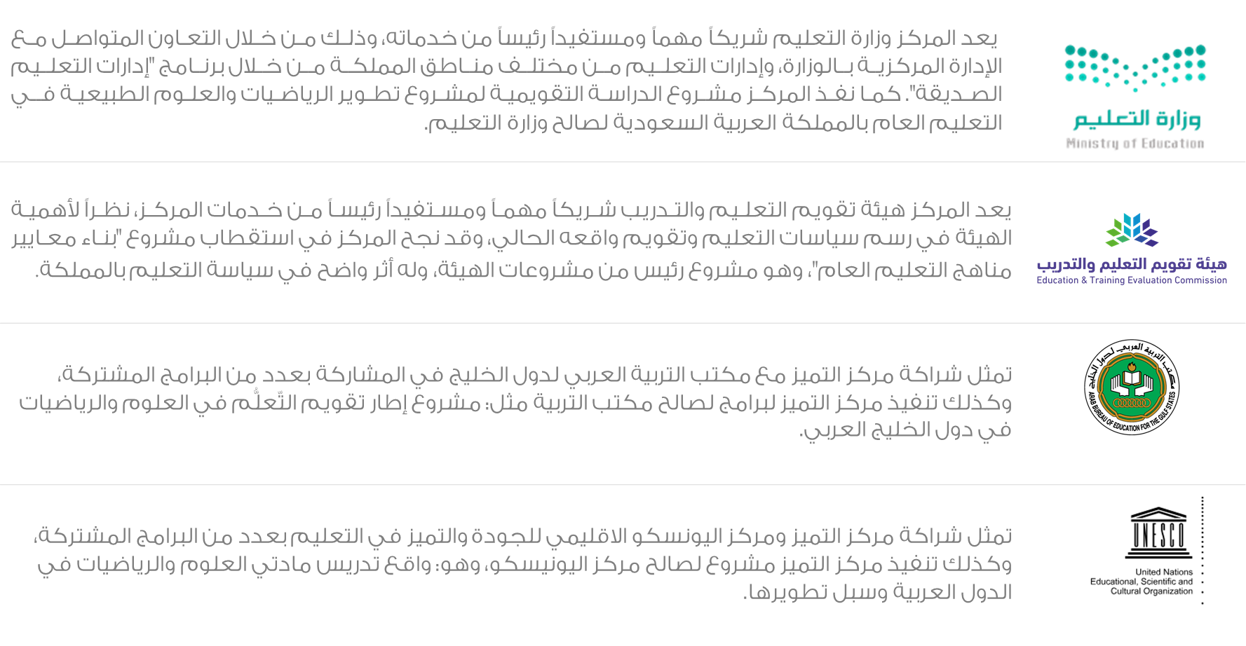 يرتبط المركز مع عدد من الشراكات الاستراتيجية المجتمعية الهامة داخل الوطن والتي تدعم دوره كمركز بحثي وتدريبي متخصص في مجال تطوير العلوم والرياضيات، ويعد أبرز الشراكات المحلية والإقليمية